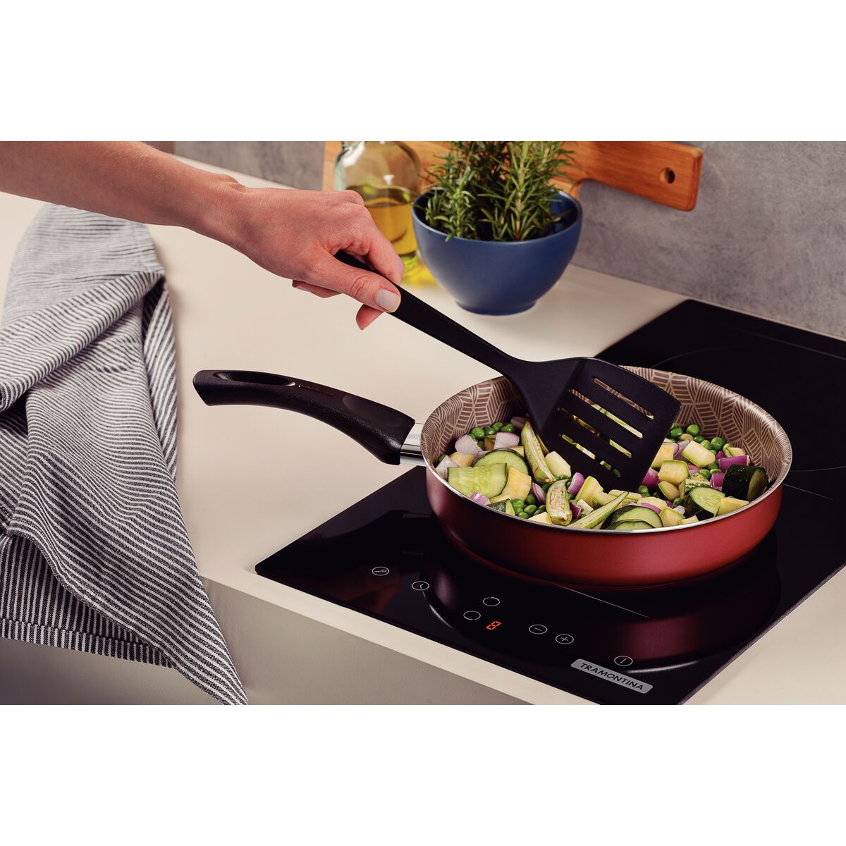 A frigideira reta Tramontina Paris em alumínio com revestimento interno e externo em antiaderente Starflon Max vermelho com espátula de nylon 20 centímetros 1,4 litros vai transformar a hora de preparar suas refeições. Produzida em alumínio com espessura de 1,8 milímetros e revestimento interno e externo de antiaderente Starflon Max, ambas características que proporcionam um cozimento rápido e uniforme dos alimentos, evitam que eles grudem em sua superfície, e devido a isso é muito mais fácil de limpar. Para sua segurança, o cabo em baquelite antitérmico não aquece e oferece maior conforto no manuseio. Além de todas essas características, ela acompanha uma espátula de nylon muito prática, que não risca e não danifica seu antiaderente. Escolha Tramontina e deixe a hora de cozinhar muito mais especial!