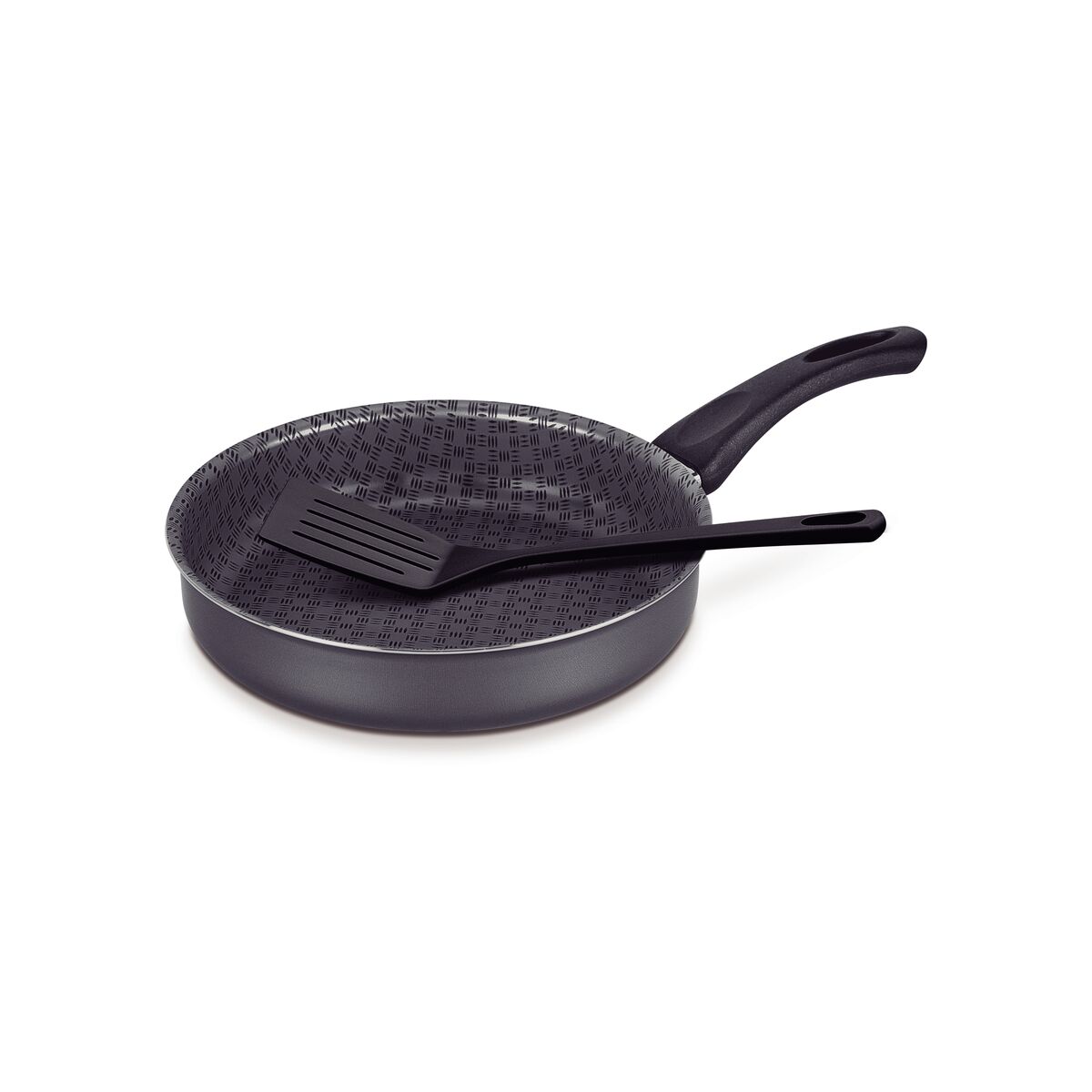 Alumínio com revestimento interno e externo de antiaderente Starflon T1. Cabo de baquelite antitérmico. Espátula de nylon.