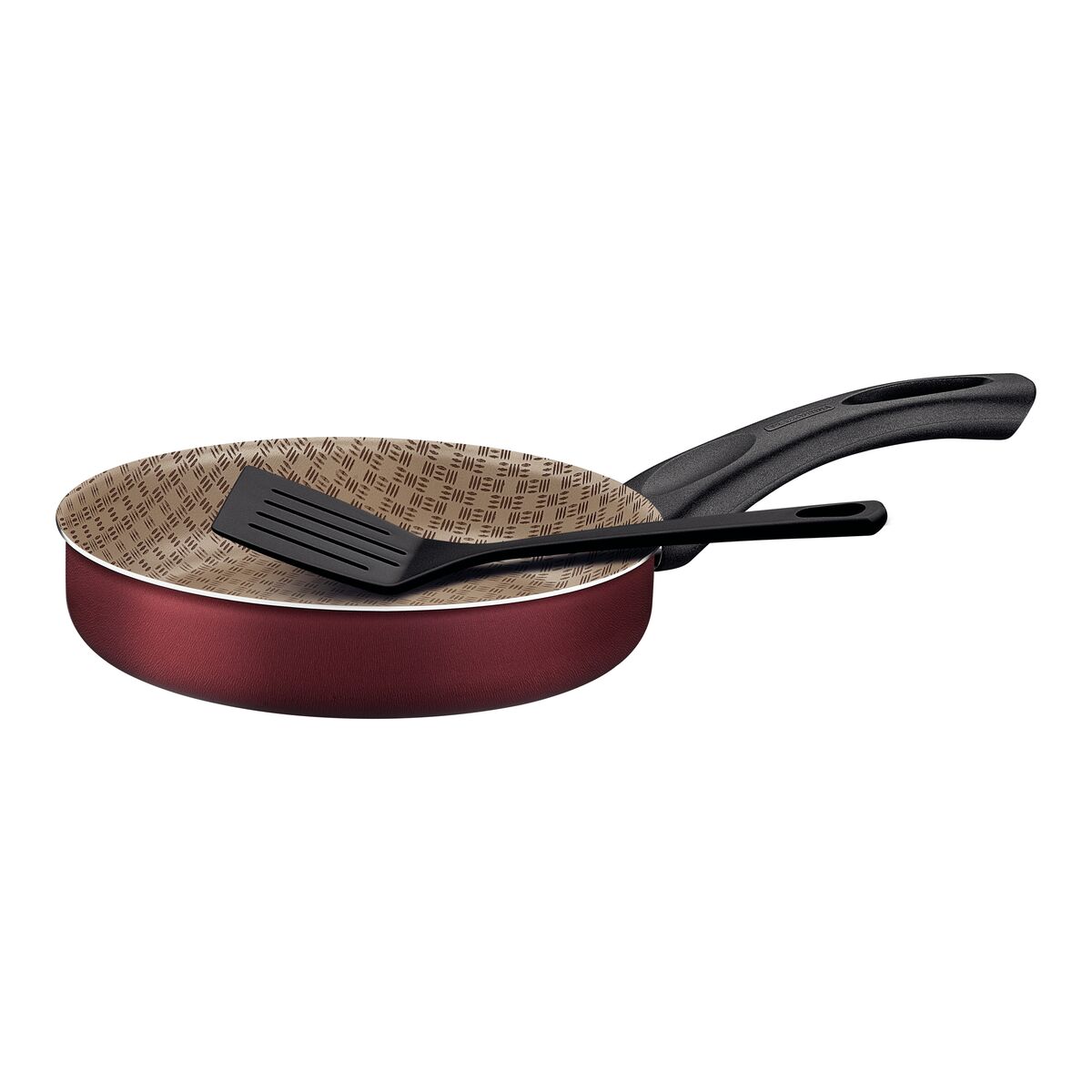 Alumínio com revestimento interno e externo de antiaderente Starflon T1. Cabo de baquelite antitérmico. Espátula de nylon.