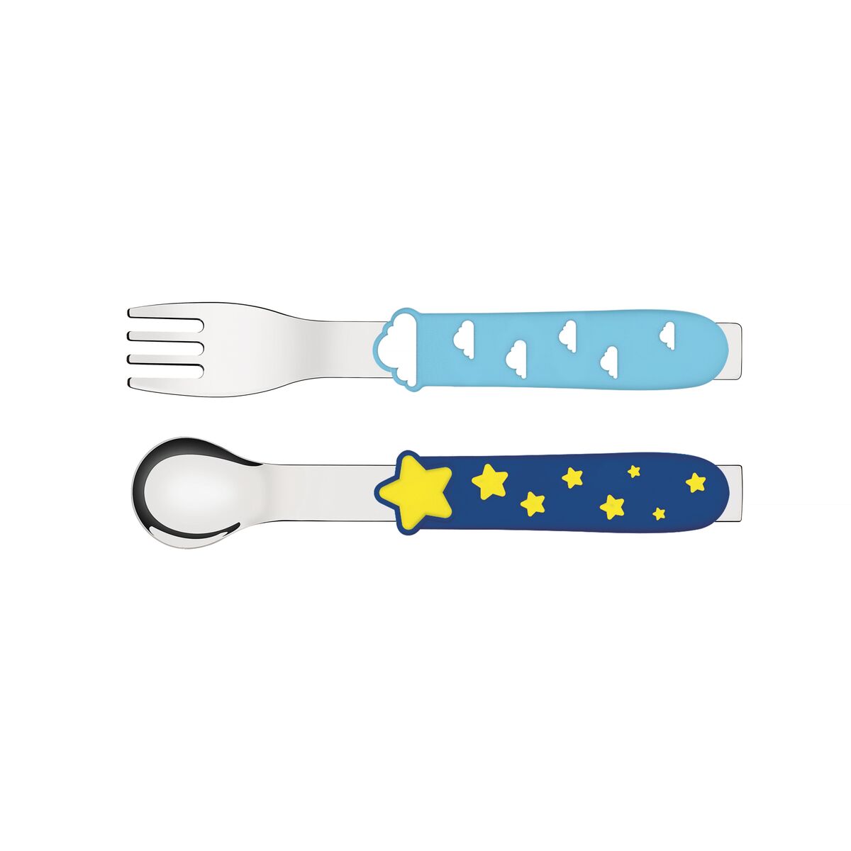 - Cielito traz a delicadeza do céu, com nuvenzinhas, sol e estrelas para alegrar o momento da refeição. As peças são fabricadas de aço inox com revestimento emborrachado no cabo, garantindo segurança e conforto para os pequenos. - Talheres com formato ergonômico, especialmente criados para incentivar e auxiliar no desenvolvimento das crianças. - Design clean e divertido. - Cantos arredondados e com acabamento perfeito. - Higiêne e segurança para as crianças.