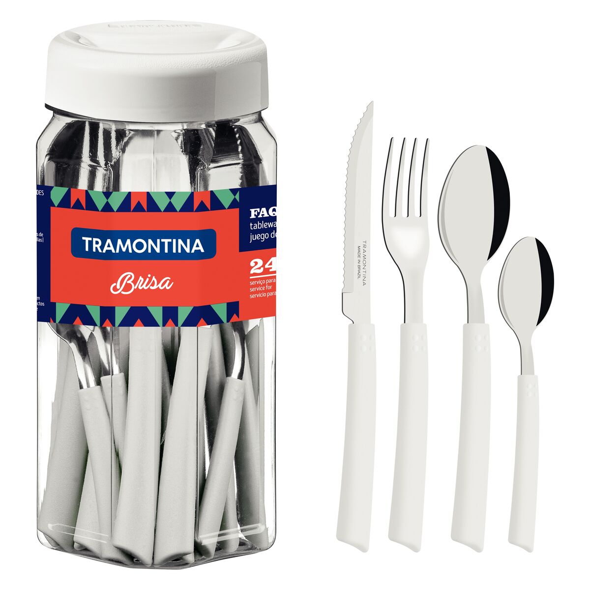 Leve à mesa a alegria das cores. Os talheres da linha Brisa tem cabos coloridos e resistentes de polipropileno. Com lâminas em aço inox, a facas, o garfos e as colheres têm alta resistência e durabilidade. As lâminas das facas recebem tratamento térmico que lhes garante vida longa ao fio. Todas as peças podem ir à máquina de lavar.