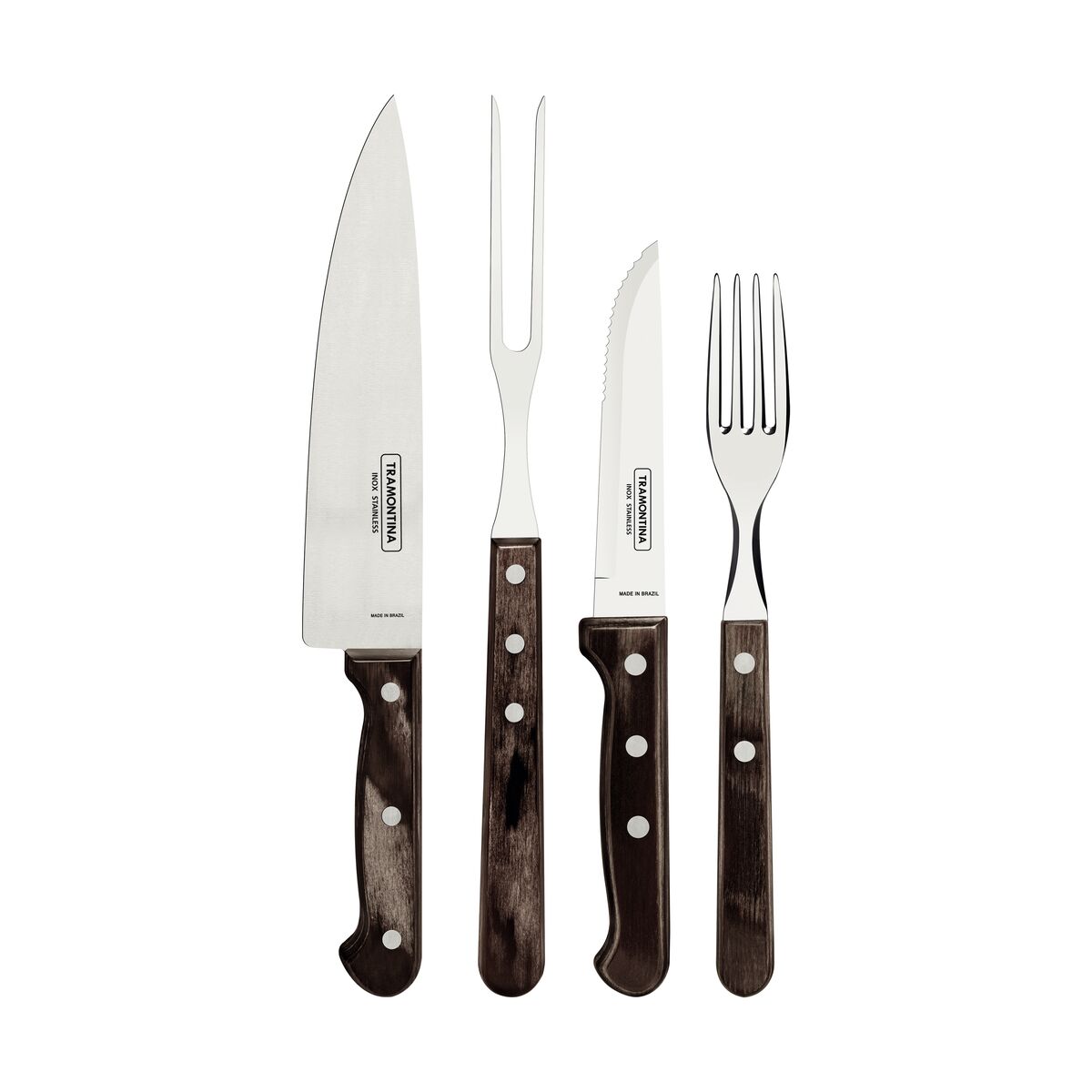 Com o jogo para churrasco Tramontina com lâmina em aço inox e cabo em madeira tratada Polywood castanho 14 peças é a escolha ideal para saborear aquele delicioso churrasco de domingo. Composto por talheres com lâmina de aço inox, ele é um jogo onde as facas têm maior durabilidade do fio devido ao tratamento térmico e os garfos tem maior espessura e uma estampagem do aço que garantem maior resistência e evitam deformações. Seus cabos são em madeira tratada Polywood, material resistente à impactos e altas temperaturas, conta com rebites de alumínio e garantem maior resistência e durabilidade. Além de todas essas características, ele pode ir à máquina de lavar louças, otimizando suas tarefas na cozinha. Um jogo especial que traz beleza à mesa em seus churrascos!