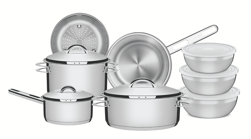 Jogo de panelas + jogo de potes aço inox com tampa plástica.