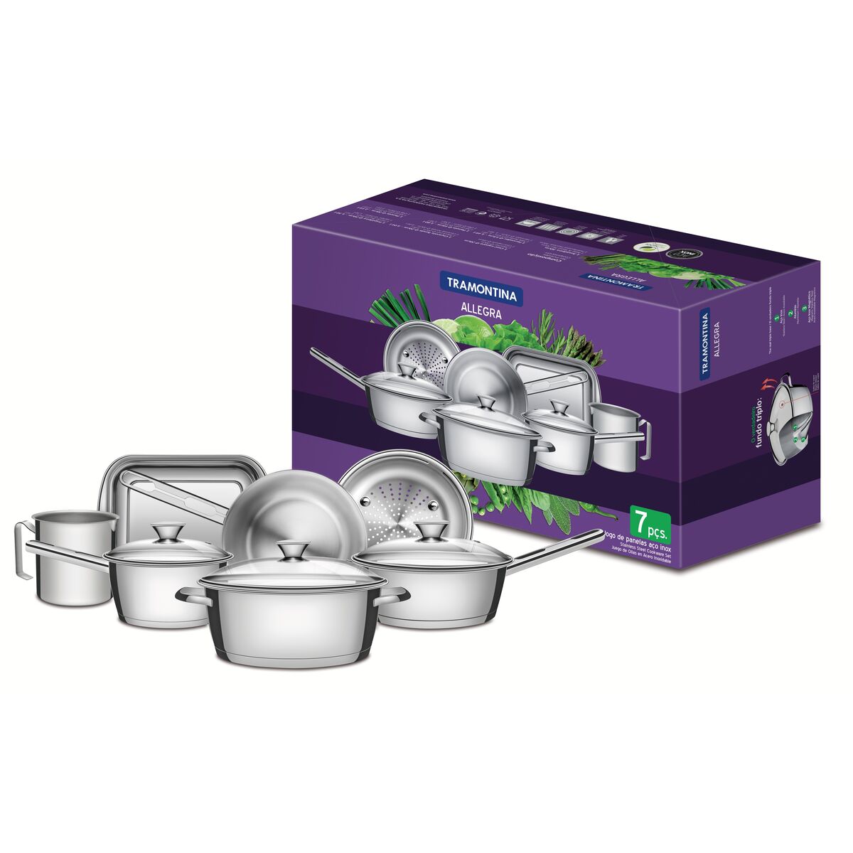 Tenha produtos práticos e diferenciados na sua cozinha. O Jogo de Panelas Tramontina Allegra em Aço Inox com Fundo Triplo 7 Peças facilita seu dia-a-dia e ainda embeleza sua cozinha. São 7 peças com design moderno que dá um toque cheio de estilo ao ambiente. Elas ainda apresentam tecnologia de fundo triplo (aço inox + alumínio + aço inox), distribuindo melhor o calor, proporcionando um cozimento mais rápido e uniforme. E o melhor, economizando mais energia! São totalmente produzidas em aço inox, material que atesta alta durabilidade e bom gosto. Acompanham tampa com saída de vapor e são ainda muito fáceis de limpar. Podendo ser lavadas diariamente na máquina de lavar louças Elas ainda impressionam pela versatilidade, podendo ser usadas em diferentes tipos de fogões.