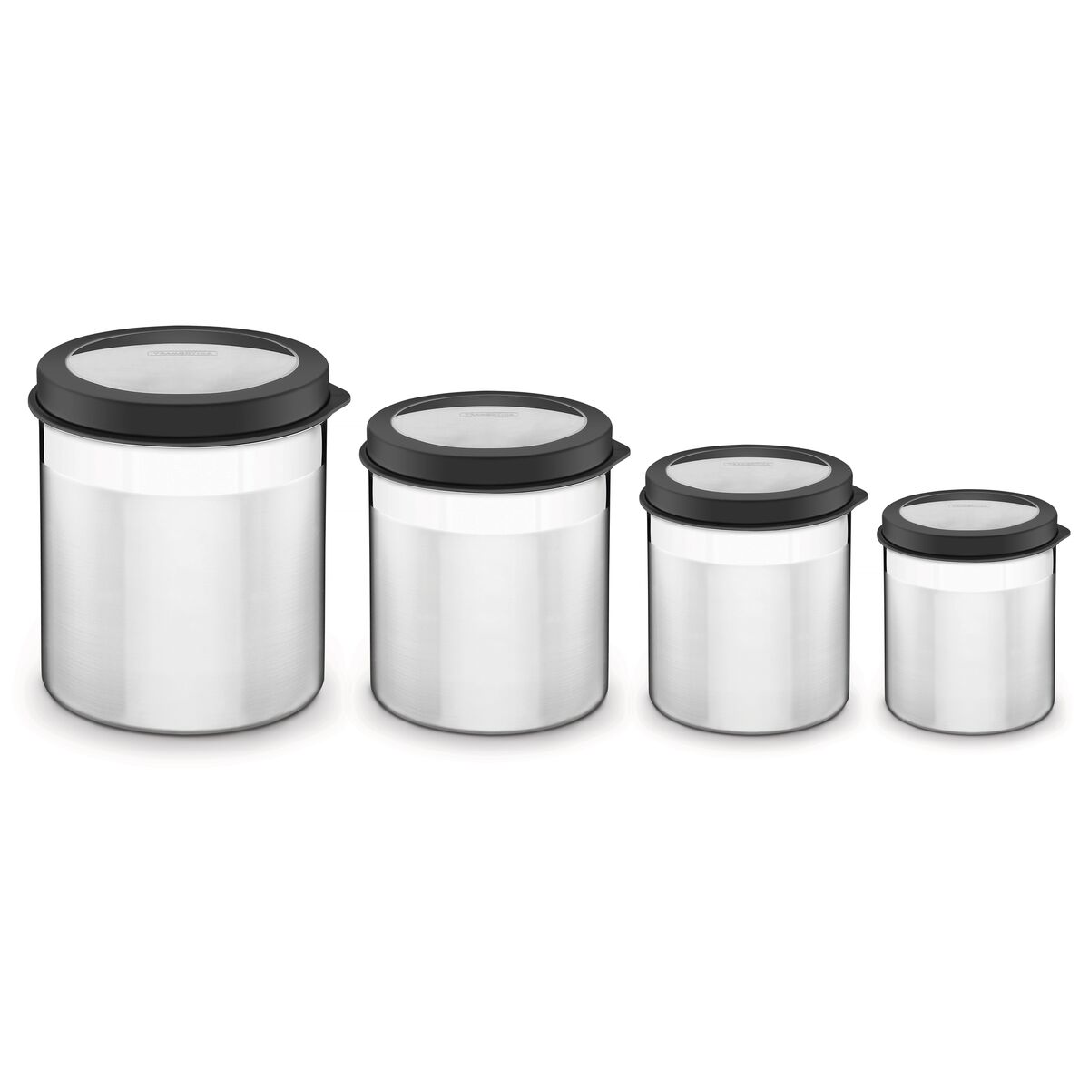 Manter a organização da cozinha é fundamental! Para isso, nada melhor do que usar acessórios que decoram o ambiente e organizam de maneira eficiente os itens que você usa diariamente. O Jogo de Potes Tramontina em Aço Inox Tampa Plástica Preta com Visor 4 Peças, da linha Cucina, garante praticidade na armazenagem, evitando desperdícios. São quatro tamanhos diferentes para as mais variadas necessidades do dia a dia, perfeito para acomodar diversos tipos de alimentos por muito mais tempo. Em aço inoxidável, altamente durável, mantém as características originais, preservando a beleza, a higiene e a durabilidade do material. Seu desenho limpo e sem cantos torna a limpeza muito mais fácil. O acabamento fosco com detalhes em brilho deixa o produto mais nobre. Ideal para o armazenamento de alimentos não perecíveis. A tampa, com visor que possibilita a visualização dos alimentos, possui vedação perfeita para a boa conservação dos alimentos. O jogo vem com uma cartela de adesivos para você colar e, assim, identificar o conteúdo de cada pote. Podem ser lavados diariamente na máquina de lavar louças. Use e abuse dos potes!