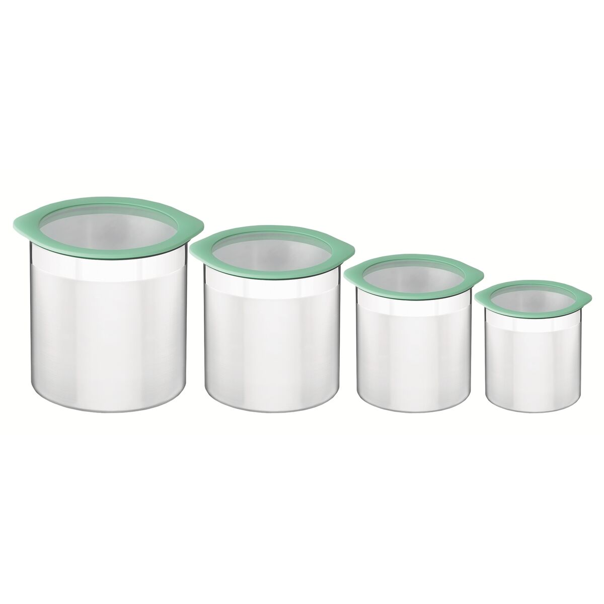 É Tetra! Dois é pouco, três é bom, mas quatro peças é o ideal! O Jogo de Potes Tramontina em Aço Inox 4 Peças, da linha Cucina, é o máximo em beleza e sofisticação! Produzidos em aço inoxidável, altamente durável, mantém as características originais, preservando a beleza, a higiene e a durabilidade do material. Este prático conjunto possui os potes perfeitos para manter sua despensa, bancada ou armário organizados. Seu desenho limpo e sem cantos torna a limpeza muito mais fácil. Com acabamento fosco e detalhes em brilho, o produto fica mais nobre. A tampa possui vedação perfeita para a boa conservação dos alimentos. Ideal para preparar e armazenar os alimentos, pode ir à geladeira ou ao freezer. Podem ser lavados diariamente na máquina de lavar louças. Mais prático, mais organizado e mais bonito para guardar, você vai se apaixonar.