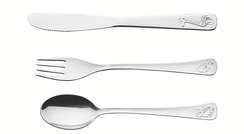 Talheres com formato ergonômico e com variação de desenhos, especialmente criados para incentivar e auxiliar no desenvolvimento das crianças.