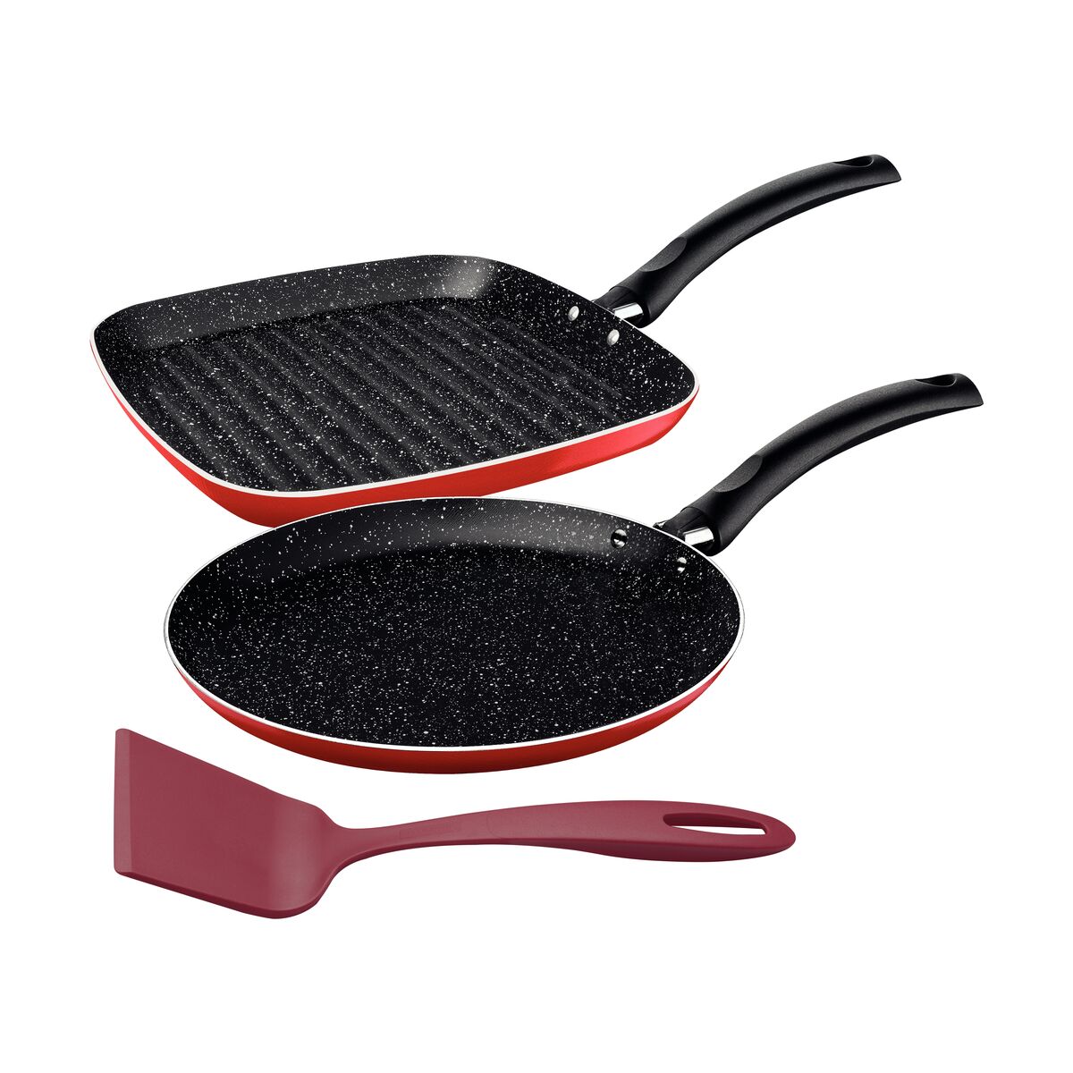 Prepare aquele steak suculento e deliciosos acompanhamentos, com o jogo de bistequeira e panquequeira Tramontina Roch em alumínio com revestimento interno em antiaderente Starflon Max e externo de poliéster vermelho com espátula 03 peças. Desenvolvidas com corpo de alumínio e revestimento interno de antiaderente Starflon Max, as peças cozinham os alimentos de maneira rápida e uniforme, sem grudar na superfície. Na parte externa, elas são revestidas de poliéster e tem cabos de baquelite antitérmico, material que não aquece e proporciona maior segurança durante o manuseio!