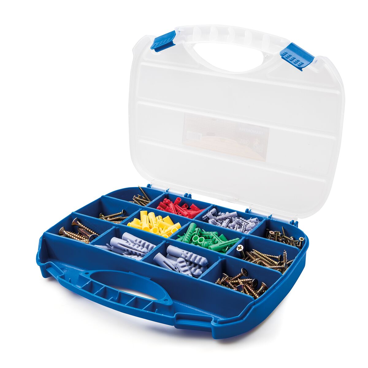 Maleta plástica para facilitar o armazenamento e transporte. Composição utilizada na fixação de diversos produtos no do dia-a-dia. As ferramentas são produzidas e testadas conforme normas específicas. Conteúdo: -60 parafusos 3x25mm; 35 parafusos 3,5x30mm; 40 parafusos 4x35mm; 25 parafusos 4x45mm; 20 parafusos 5x40mm; 15 parafusos 6x50mm; 80 buchas cinza 5mm; 40 buchas vermelhas 6mm; 25 buchas amarelas 8mm; 25 buchas verdes 8mm; 20 buchas cinzas 10mm.