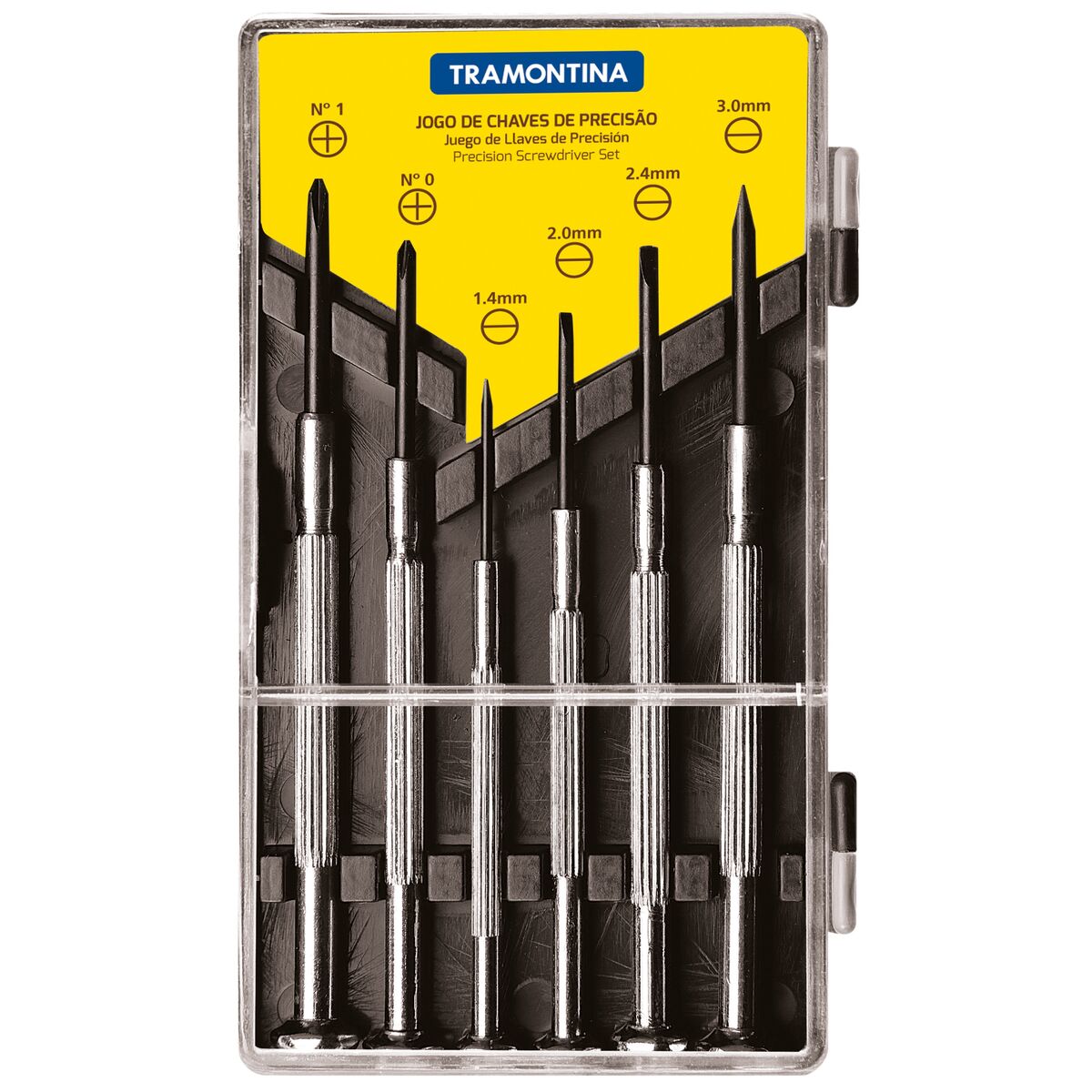 Haste em aço cromo vanádio. Acabamento fosfatizado. Possui cabeça giratória para facilitar o manuseio com apenas uma das mãos. Acompanha estojo plástico para guardar as chaves. As hastes das chaves de fenda são testadas em máquinas de ensaio específicas, para verificar o perfeito balanço entre resistência mecânica e dureza. Cabos injetados com material de alta resistência. Os dimensionais das pontas são verificados com gabaritos-padrão, calibrados e certificados. As ferramentas são produzidas y testadas conforme normas específicas. Conteúdo: 4 chaves ponta chata 1.4, 2, 2.4, 3 mm; 2 chaves ponta cruzada nr. 0, nr. 1.
