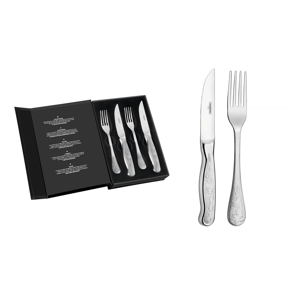 O Jogo para Churrasco Tramontina em Aço Inox com Estojo Cabo com Desenhos em Alto Relevo 4 Peças da linha Classic, é a escolha ideal para quem quer preparar apreciar um bom churrasco do melhor jeito possível. O jogo conta com garfos com dentes polidos na parte interna, com formato apropriado para a boca e bordas arredondadas para proporcionar maior conforto no uso. Facas totalmente temperadas, que garantem maior durabilidade no fio de corte serrilhado e maior resistência à corrosão, e por suas características de temperabilidade, não riscam as porcelanas. As peças são produzidas em aço inox, o que lhe confere uma alta durabilidade, além de contar com um design único e com desenhos em alto relevo, proporcionando uma beleza exclusiva.