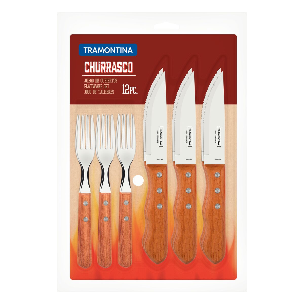 Para saborear aquela carne deliciosa do churrasco de domingo com a família e os amigos, conte com o jogo de talheres para churrasco Tramontina Dynamic com lâminas em aço inox e cabos de madeira natural 12 peças. Os talheres que compõem o jogo são produzidos com lâminas em aço inox e cabos de madeira, onde as facas contam com tratamento térmico e os garfos e colheres contam com estampagem e espessura especial. As peças ainda contam com rebites de alumínio e vão proporcionar maior segurança e resistência!