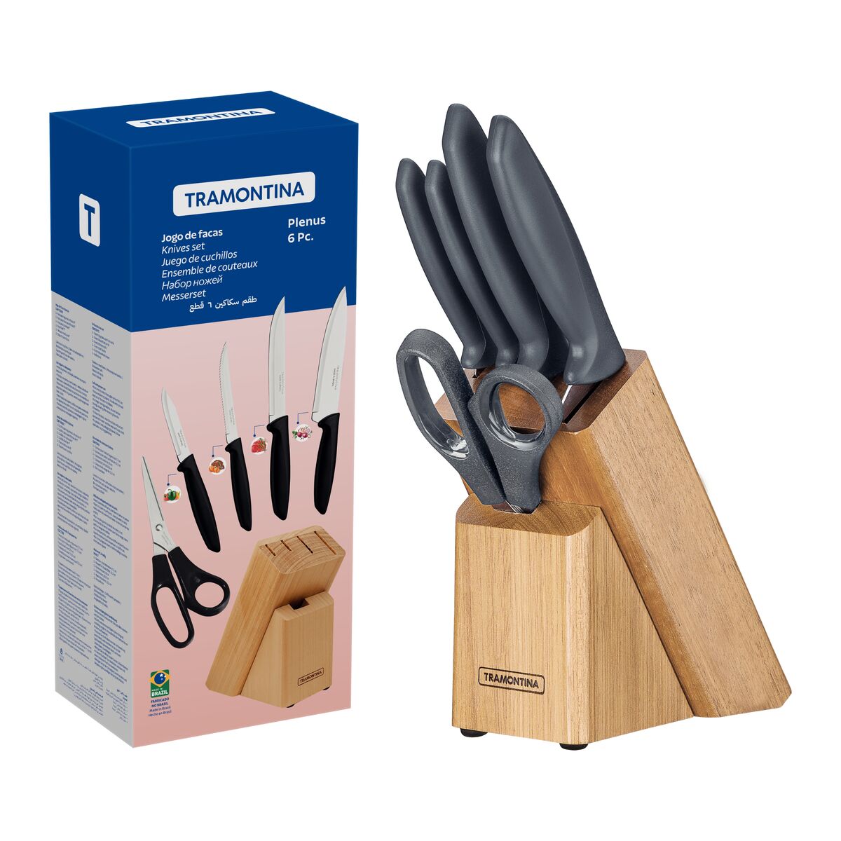 Jogo de Facas Tramontina Plenus com Lâminas em Aço Inox Cabos de Polipropileno Cinza e Suporte de Madeira 6 Peças