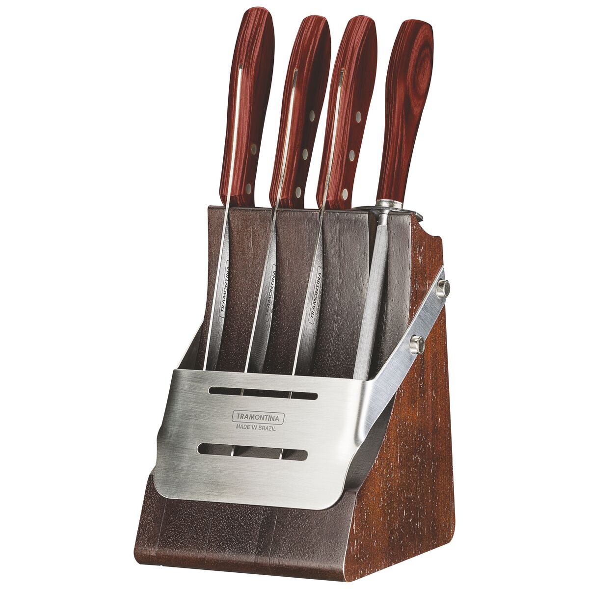 Lâminas de aço inox. Cabos de Polywood. Chaira de aço carbono. Suporte de madeira com detalhe de aço inox.