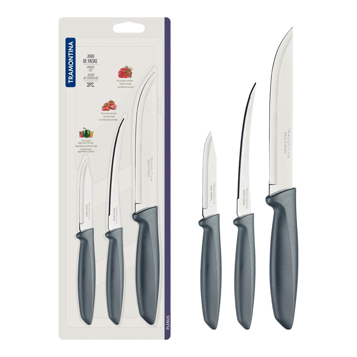 Jogo de Facas Tramontina Plenus com Lâminas em Aço Inox e Cabos de Polipropileno Cinza 3 Peças