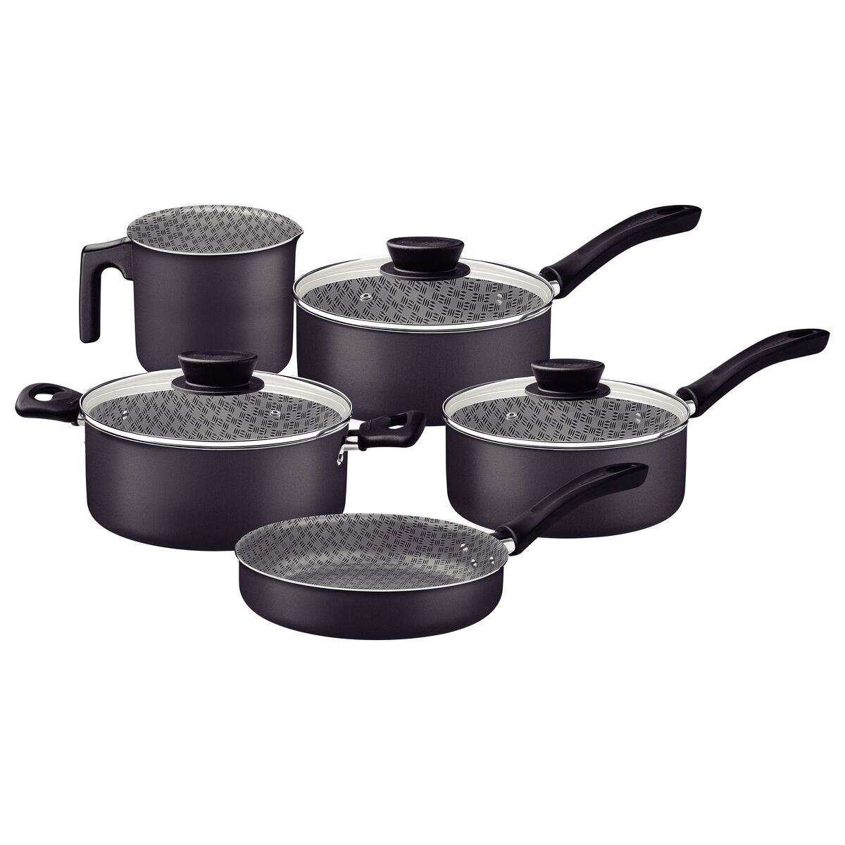 Com o jogo de panelas Tramontina em alumínio com revestimento interno e externo em Starflon Max grafite 05 peças você terá os utensílios básicos para o preparo das suas refeições e com qualidade. Desenvolvidas em alumínio com revestimento interno e externo em antiaderente Starflon Max, suas peças garantem o cozimento dos alimentos de maneira rápida e uniforme e evitam que eles grudem em sua superfície. Suas panelas e caçarolas vem tampas de vidro temperado com bordas de aço inox, possuem cabos e alças em baquelite antitérmico e pegadores em nylon, ambos materiais que não aquecem e proporcionam maior segurança e conforto durante o manuseio. O jogo ainda pode ser levado na máquina lavar louças e vai otimizar seu dia a dia na cozinha!