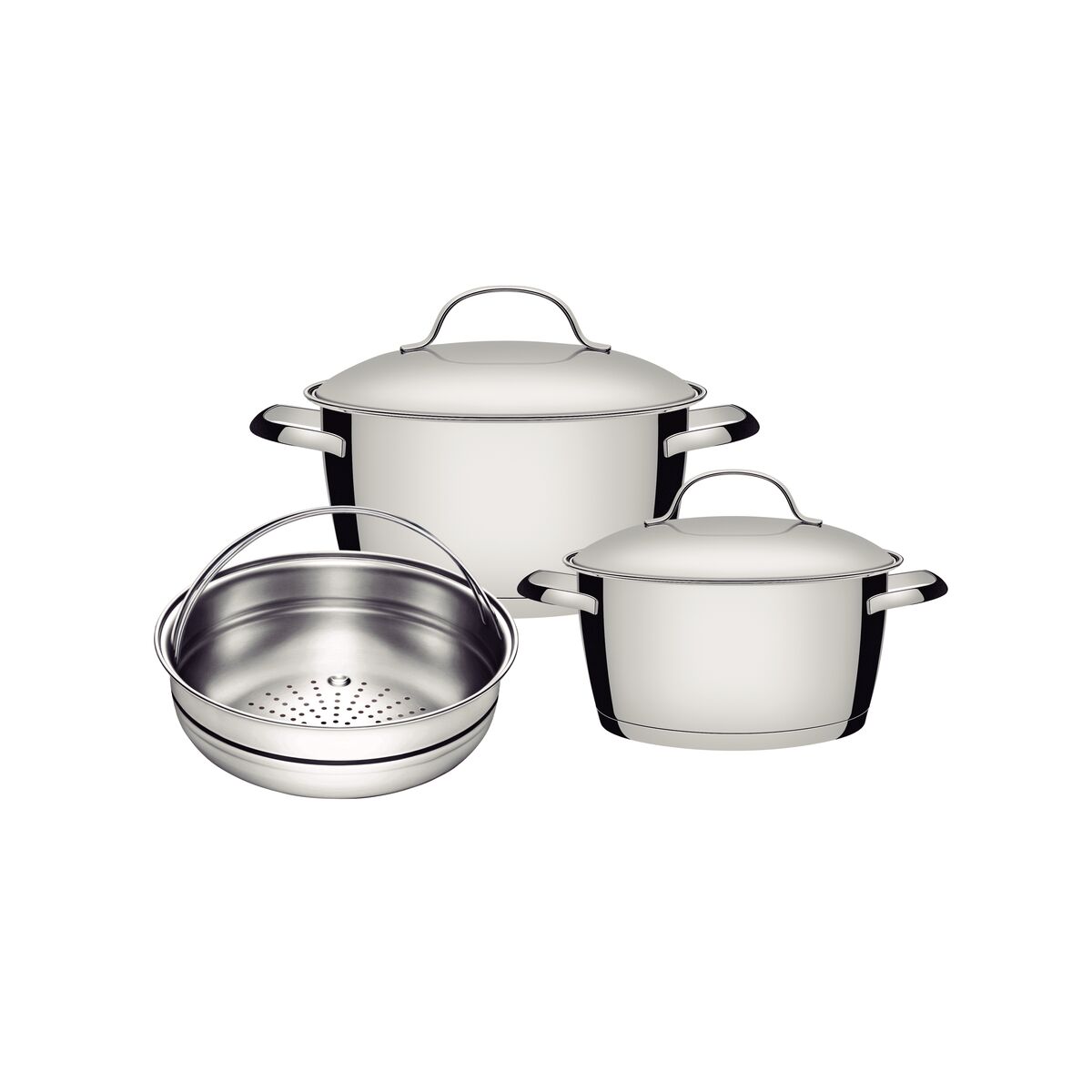 Tenha produtos práticos e diferenciados na sua cozinha. O Jogo de Panelas Tramontina Allegra em Aço Inox com Fundo Triplo 3 Peças facilita seu dia-a-dia e ainda embeleza sua cozinha. São 3 peças com design moderno que dá um toque cheio de estilo ao ambiente. Elas ainda apresentam tecnologia de fundo triplo (aço inox + alumínio + aço inox), distribuindo melhor o calor, proporcionando um cozimento mais rápido e uniforme. E o melhor, economizando mais energia! São totalmente produzidas em aço inox, material que atesta alta durabilidade e bom gosto. Acompanham tampa com saída de vapor e são ainda muito fáceis de limpar. Podendo ser lavadas diariamente na máquina de lavar louças Elas ainda impressionam pela versatilidade, podendo ser usadas em diferentes tipos de fogões.