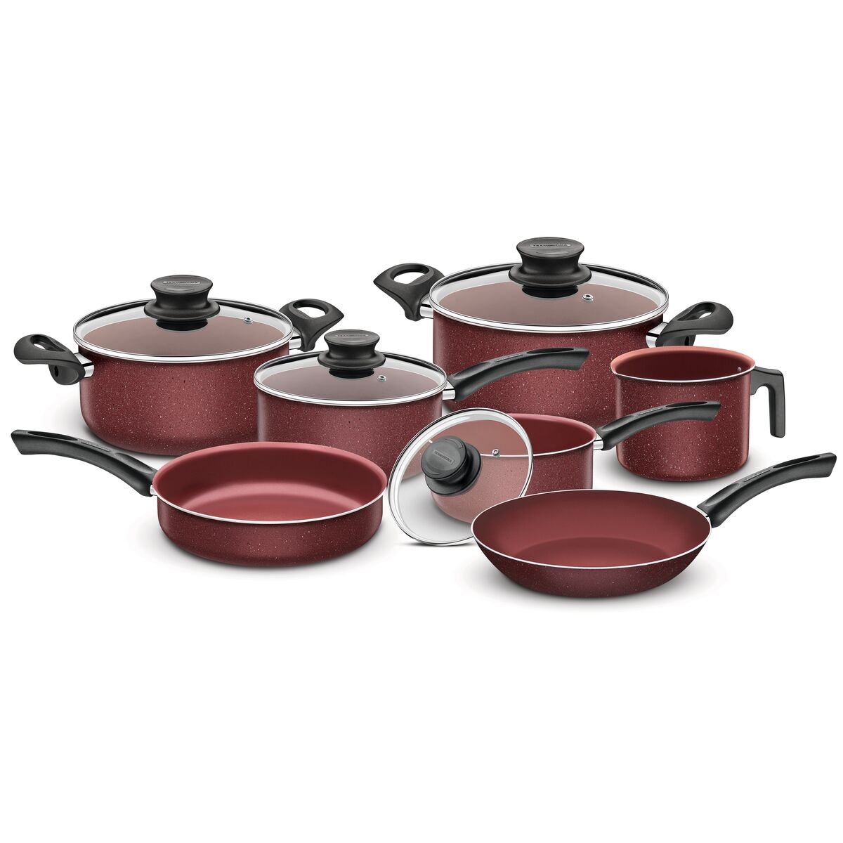 Alumínio com revestimento interno e externo de antiaderente Starflon T1. Cabos, alças de baquelite antitérmico e pegadores de nylon. Tampas de vidro temperado com saída de vapor e bordas de aço inox.