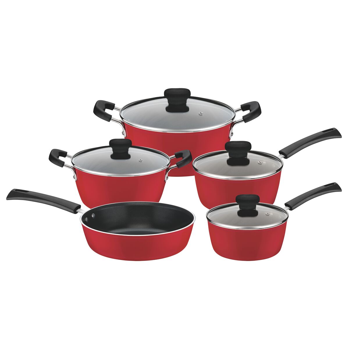 Você vai encontrar praticidade e tecnologia diferenciada com o Jogo de Panelas Tramontina Vermelho em Alumínio com Revestimento Interno Antiaderente Starflon T3 com Cabo/Alças Baquelite 5 Peças da Linha Piacenza. Produzido em alumínio com revestimento interno em antiaderente Starflon T3 é o único com tecnologia T. Possui maior poder de antiaderência, maior resistência à abrasão, maior durabilidade, maior facilidade na limpeza e livre de PFOA. Com revestimento externo em silicone vermelho, possui cabos, alças e pegadores em baquelite antitérmico que não esquenta, protegendo suas mãos do calor. As tampas de vidro temperado, tem saída de vapor e bordas de aço inox.