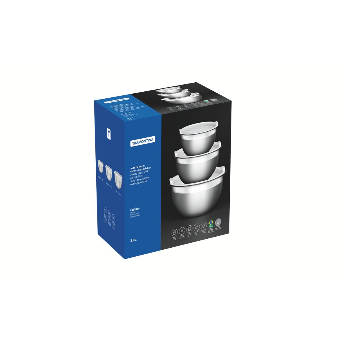 O Jogo de Potes Tramontina em Aço Inox com Tampa Plástica 3 Peças, da linha Cucina, deixa sua cozinha mais completa, bonita e organizada. Produzido em aço inoxidável, conta com acabamento fosco por dentro e brilhante por fora, altamente durável, mantém as características originais, preservando a beleza, a higiene e a durabilidade do material. Com vedação perfeita, os potes podem ser utilizados para transportar, armazenar alimentos refrigerados e até para misturar e preparar saladas. Seu desenho limpo e sem cantos torna a limpeza muito mais fácil. Acabamento fosco com detalhes em brilho deixa o produto mais nobre. A tampa possui vedação perfeita para a boa conservação dos alimentos. Ideal para preparar e armazenar os alimentos, pode ir à geladeira ou ao freezer. Podem ser lavados diariamente na máquina de lavar louças. Potes lindos para você organizar tudo!