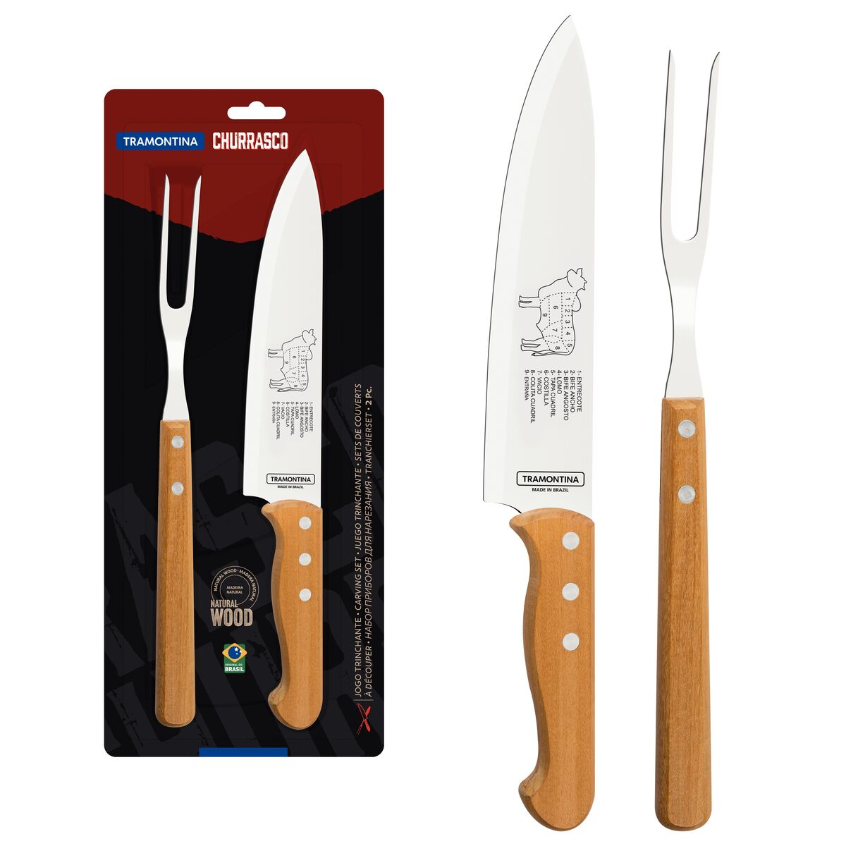 O churrasco da sua casa nunca esteve tão completo. Com o jogo trinchante Tramontina Churrasco com lâminas de aço inox e cabos de madeira natural 2 peças servir seus convidados será ainda mais prático! saboroso! A faca e o garfo trinchante do jogo possuem lâminas em aço inox e características únicas. A faca de oito polegadas garante maior durabilidade do fio de corte devido ao tratamento térmico e garfo conta com maior espessura e uma estampagem do aço que garante maior resistência. São dois produtos especiais que ainda embelezam na hora de servir. Com cabo de madeira natural, eles levam mais conforto e bem-estar para o momento de servir o churrasco.