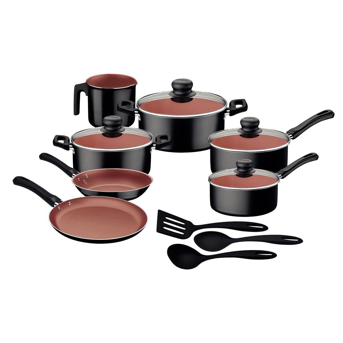O kit cozinha Tramontina Caribe em alumínio com revestimento interno em alumínio antiaderente Starflon Max e externo de poliéster preto 10 peças é a escolha ideal para completar sua cozinha e deixá-la preparada para o preparo das suas refeições. Desenvolvidas em alumínio com revestimento em antiaderente Starflon Max, suas peças cozinham os alimentos de maneira rápida e uniforme, sem grudar na superfície, o que as tornam ainda, muito fáceis de limpar. As panelas e caçarolas vem com tampas de vidro temperado com borda de aço inox e todas as peças tem seus cabos, alças e pegadores em material antitérmico , que não aquece e oferece maior segurança durante o manuseio. O kit ainda conta com utensílios de nylon que permitem uso em temperaturas de até 180 °C e são ideais para preparar e servir e para superfície antiaderentes!