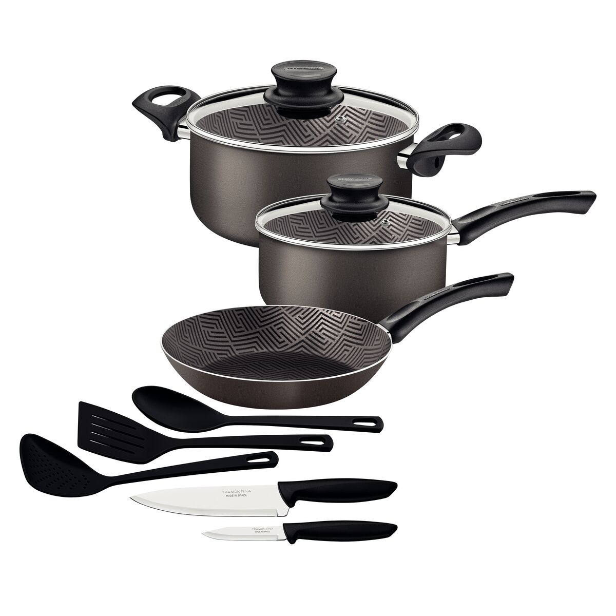 Toda a qualidade Tramontina está presente no kit cozinha Tramontina Paris em alumínio com revestimento interno e externo em antiaderente Starflon Max chumbo 10 peças. Perfeito para lhe acompanhar no dia a dia, ele tem a caçarola, a panela e a frigideira produzidas em alumínio com revestimento antiaderente Starflon Max. Devido a essas características, elas preparam os alimentos de maneira rápida e uniforme, sem que grudem em sua superfície. O kit vem com duas tampas de vidro temperado com saída de vapor e bordas de aço inox, utensílios de nylon que permite o uso em temperaturas até 180 °C e com facas com lâminas de aço inox e cabos de polipropileno. Para sua segurança, os cabos e pegadores são em material antitérmico; e para sua praticidade, elas podem ser levadas à máquina de lavar louças!