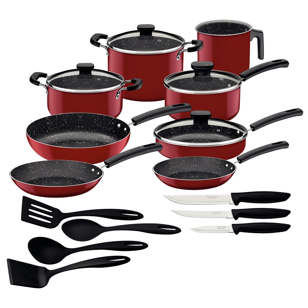 Leve o kit de cozinha Tramontina em alumínio com revestimento interno e externo em antiaderente Starflon Max vermelho 19 peças para o seu dia a dia e garanta maior praticidade para o preparo das suas refeições. Produzido em alumínio com revestimento interno e externo em antiaderente Starflon Max, as peças garantem o cozimento rápido e uniforme dos alimentos, evitam que eles grudem em sua superfície, são muito fáceis de limpar e mais duráveis. Os cabos e alças são em material antitérmico e não aquecem, o que garante um manuseio muito mais seguro e confortável. Um kit prático, que pode ir à máquina de lavar louças e que acompanha tampas de vidro temperado com bordas de aço inox que facilitam o preparo das suas receitas!