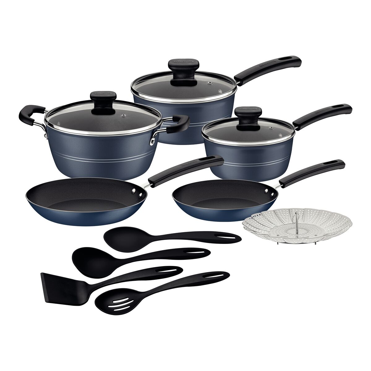 O kit cozinha Tramontina Sicília em alumínio com revestimento interno e externo em antiaderente Starflon Excellent azul 13 peças é a escolha ideal para quem deseja uma cozinha completa, com itens de alta qualidade e cheios de estilo. Desenvolvidas com corpo de alumínio com espessura especial e revestimento em antiaderente Starflon Excellent, suas peças de forno e fogão proporcionam cozimento rápido e uniforme, sem que os alimentos grudem em sua superfície. Suas panelas e caçarolas vem com tampas de vidro temperado com bordas de aço inox e possuem cabos, alças e pegadores em materiais antitérmicos, que não aquecem e oferecem toda a segurança e conforto que você merece durante o manuseio. Os utensílios de nylon que acompanham o kit não riscam, nem danificam o antiaderente das demais peças e podem ser utilizados em temperaturas de até 180 °C. Todos os itens do kit podem ir à máquina de lavar louças e vão facilitar seu dia a dia.