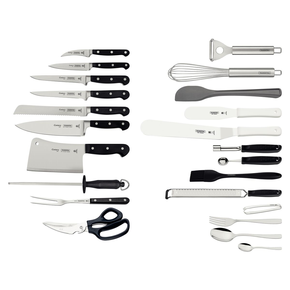 Se você é um amante da boa gastronomia e não abre mão de receber seus amigos em casa com o melhor, não há outra coisa a fazer a não ser garantir o kit para chefs Tramontina Century com lâminas em aço inox e cabos de policarbonato e fibra de vidro com maleta 24 peças. Com ele você tem, em uma linda maleta de nylon, facas com lâminas de aço inox de altíssima qualidade que, aliada ao eficiente com tratamento térmico diferenciado, composto por têmpera, sub-zero e revenimento. Seus cabos de policarbonato com fibra de vidro; chaira com haste em aço inox com superfície diamantada e cabo em ABS; batedor, descascador, boleador e coador de aço inox, um pegador e espátula de aço inox com silicone, este é um kit completo. Além de tudo isso, você ainda tem um termômetro com haste de aço inox, uma tesoura e faca de ostra com lâmina em aço inox e cabo em polipropileno e uma pinça de aço inox. É ou não é o conjunto mais completo para você fazer suas melhores receitas em casa? Não perde tempo. Seja o Chef mais elogiado da sua cozinha e arranque sorrisos e elogios dos seus convidados.