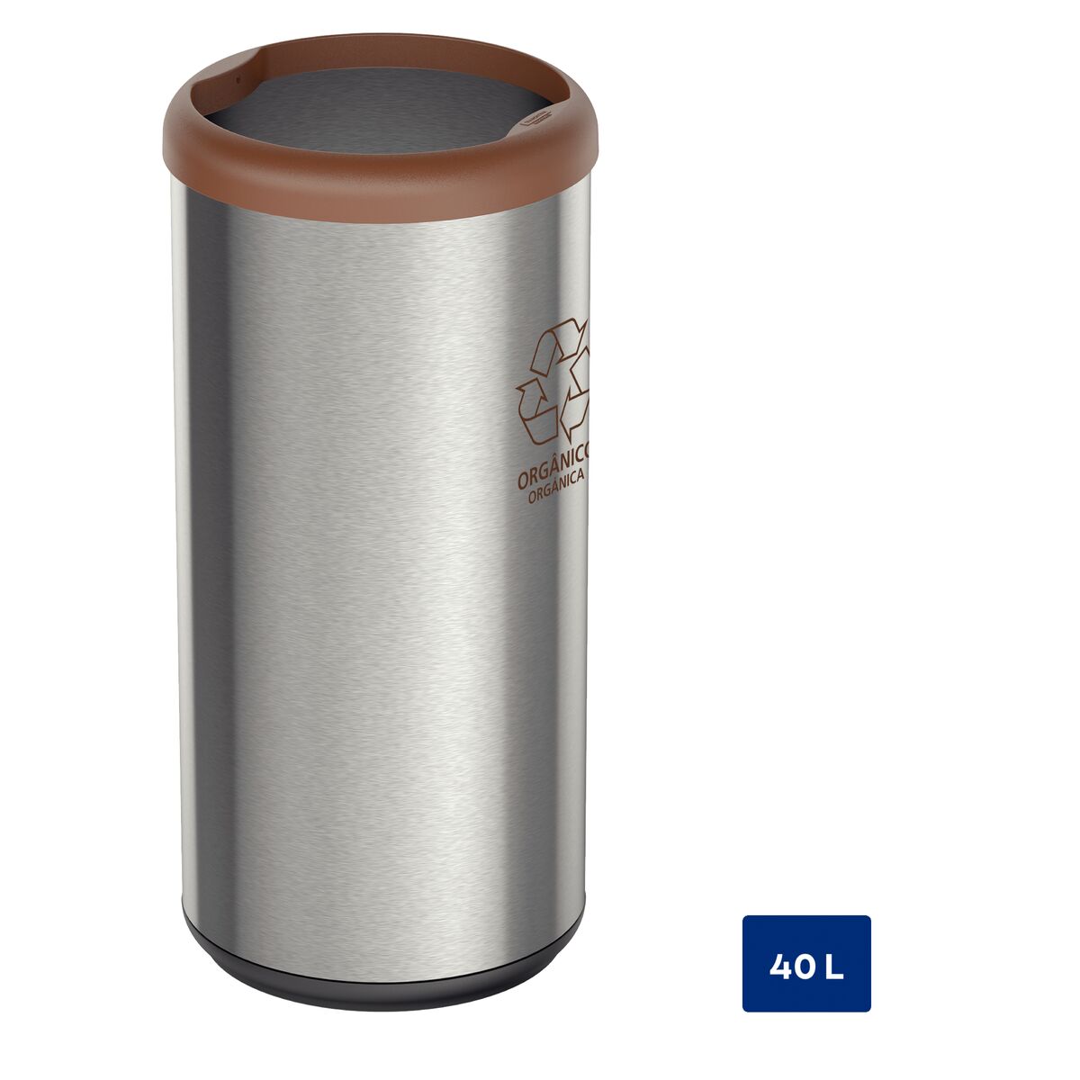Lixeira Cápsula Selecta Plus 40L Fabricado no Brasil. Produto: Pensado para ambientes domésticos, empresariais ou de grande circulação de pessoas - escolas, restaurantes, supermercados, shoppings centers, entre outros - o modelo possibilita a correta separação dos resíduos. O adesivo marrom (acompanha o produto) indica que a lixeira é para descarte de resíduos orgânicos. Material: Fabricada em Aço Inox 304 com acabamento polido, esta lixeira oferece ainda aro e base em polipropileno.