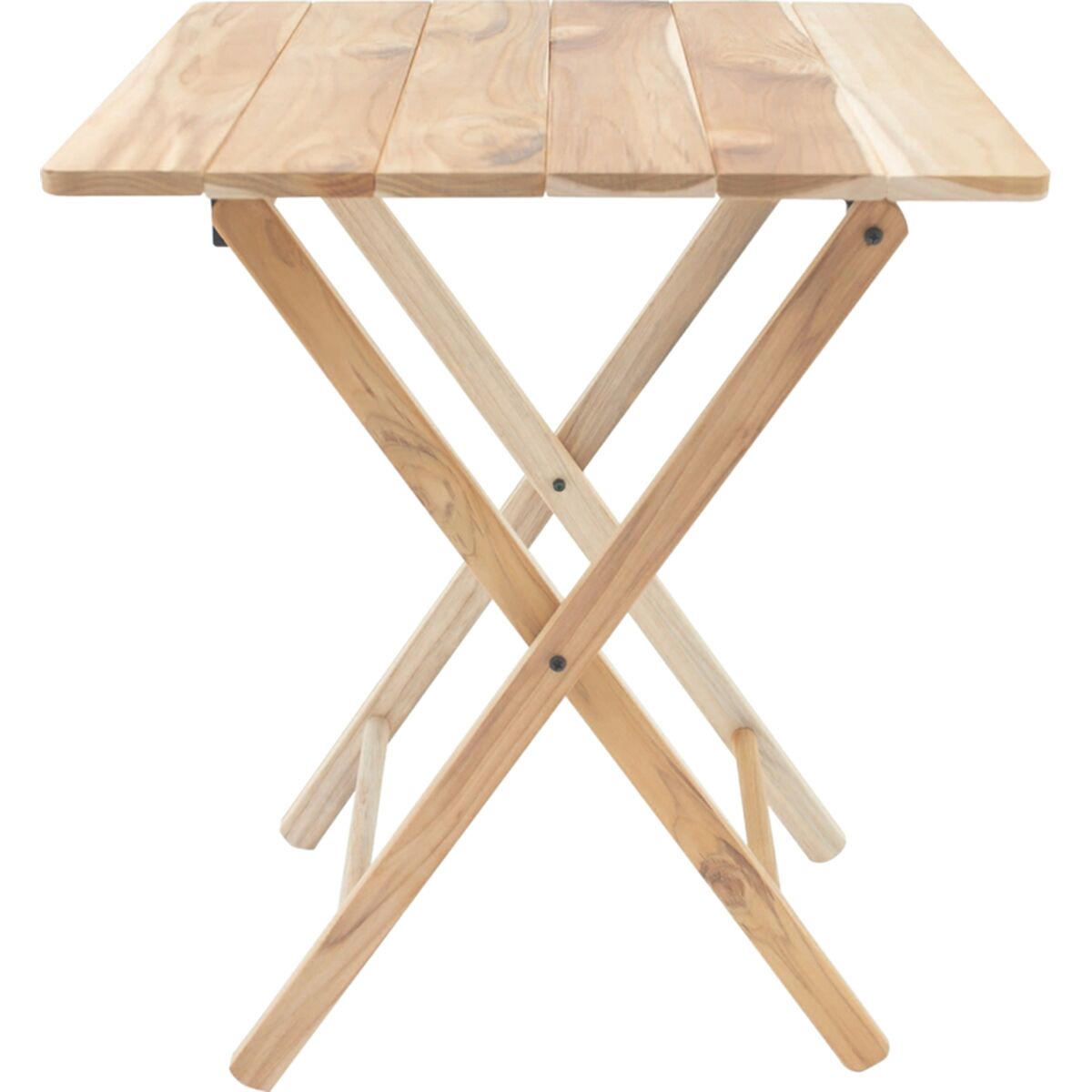Mesa produzida em madeira tipo Teca com acabamento natural. O produto é dobrável e entregue montado.