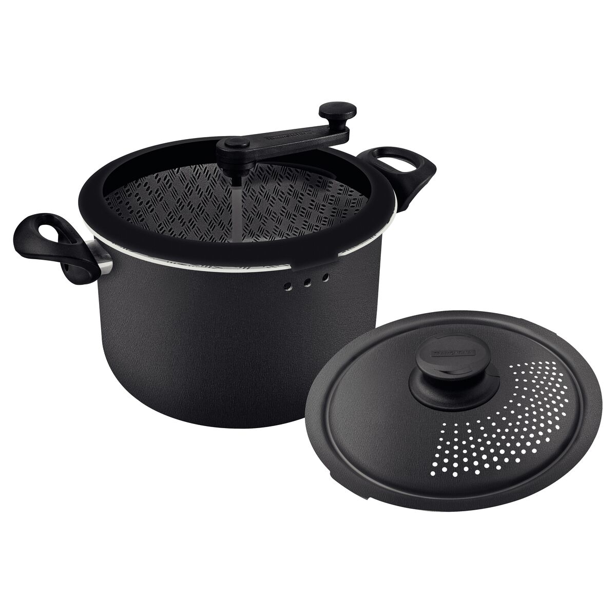 Alumínio com revestimento interno e externo de antiaderente Starflon T1. Alças de baquelite antitérmico, pegador e manípulo de nylon. Tampa para espagueteira de alumínio com furos escorredores. Tampa para pipoqueira de vidro temperado com borda de silicone.