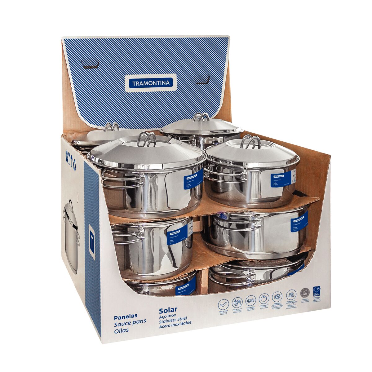 - Um clássico da Tramontina, a Solar é símbolo de durabilidade e praticidade. - Totalmente feitas em aço inox, por isso não solta nenhum resíduo nos alimentos, mantendo-os saudáveis. - Altamente durável, mantém suas características originais, preservando a beleza, a higiene e a durabilidade do material. - O fundo triplo (aço inox + alumínio + aço inox) distribui o calor uniformemente, proporcionando um cozimento mais rápido e uniforme, economizando energia e deixando os alimentos aquecidos por mais tempo. - Podem ir ao forno para gratinar ou finalizar pratos, na temperatura máxima de 260°C. - Design diferenciado e moderno, com acabamento em alto brilho. - Desenho limpo e sem cantos torna a limpeza mais fácil. - Tampas com saída de vapor e encaixe perfeito. - Podem ser lavadas diariamente na máquina de lavar louças. - Podem ser utilizadas nos fogões: gás, elétrico, vitrocerâmico e indução.