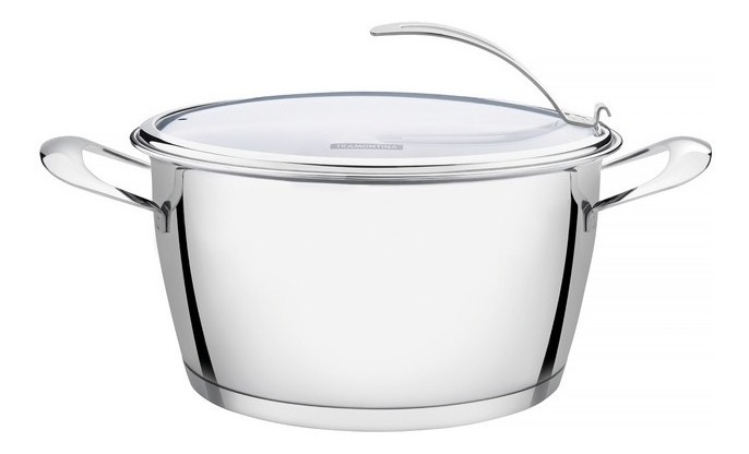 Material: aço inox. Tampa de vidro temperado com borda e pegador de aço inox. Produto com fundo triplo (aço inox + alumínio + aço inox).