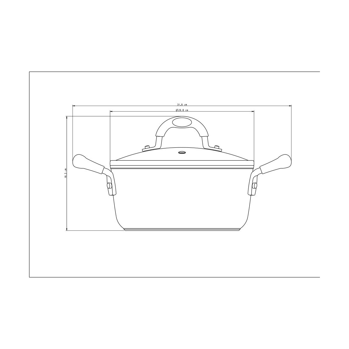 Alumínio com revestimento interno de antiaderente Starflon T3 e externo de silicone. Alças e pegador de aço inox com proteção de silicone. Tampa de vidro temperado com saída de vapor e borda de aço inox.