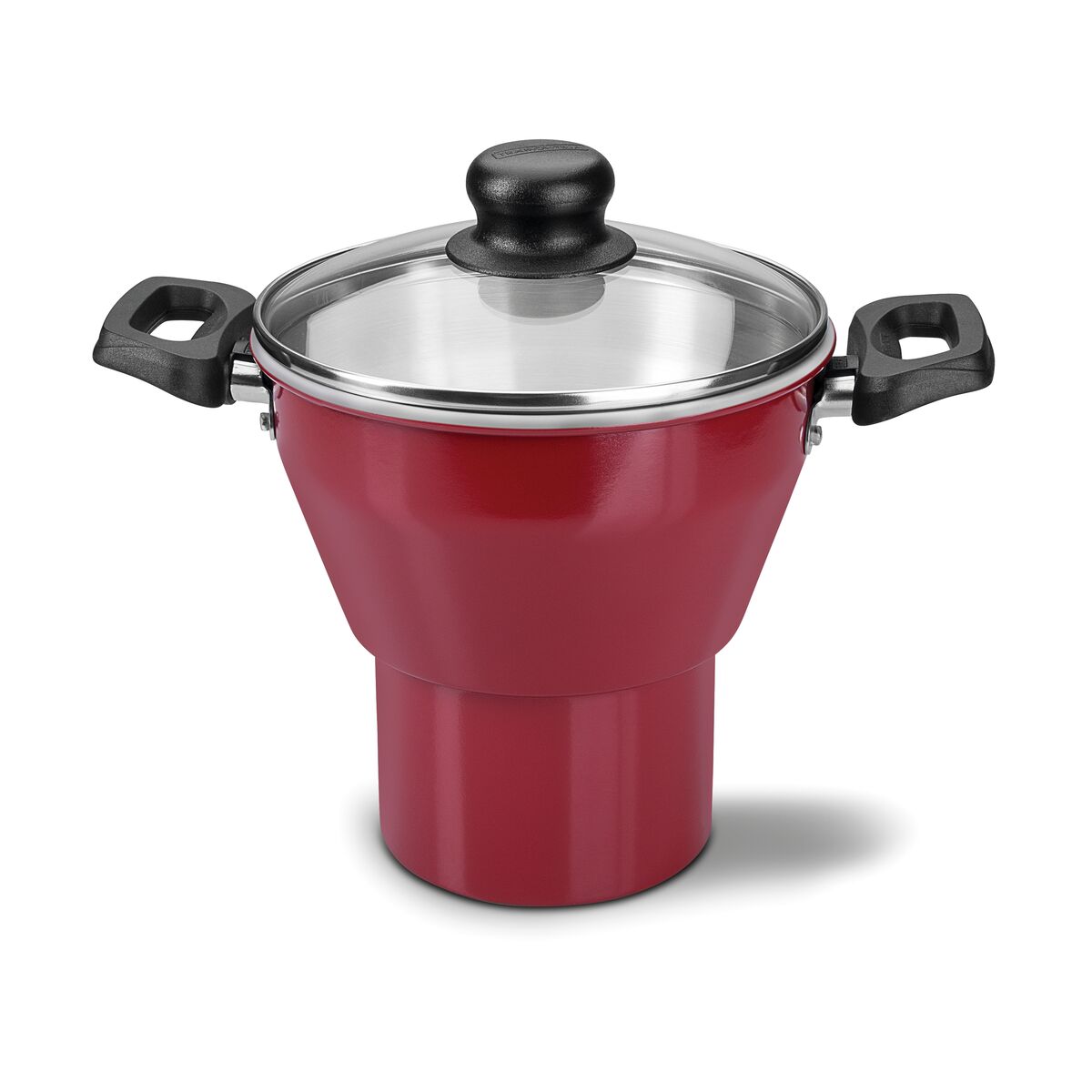 Allumínio com acabamento interno satinado y revestimento externo siliconado. Tampa de vidro temperado. Alças de baquelite antitérmico e pegador de nylon.