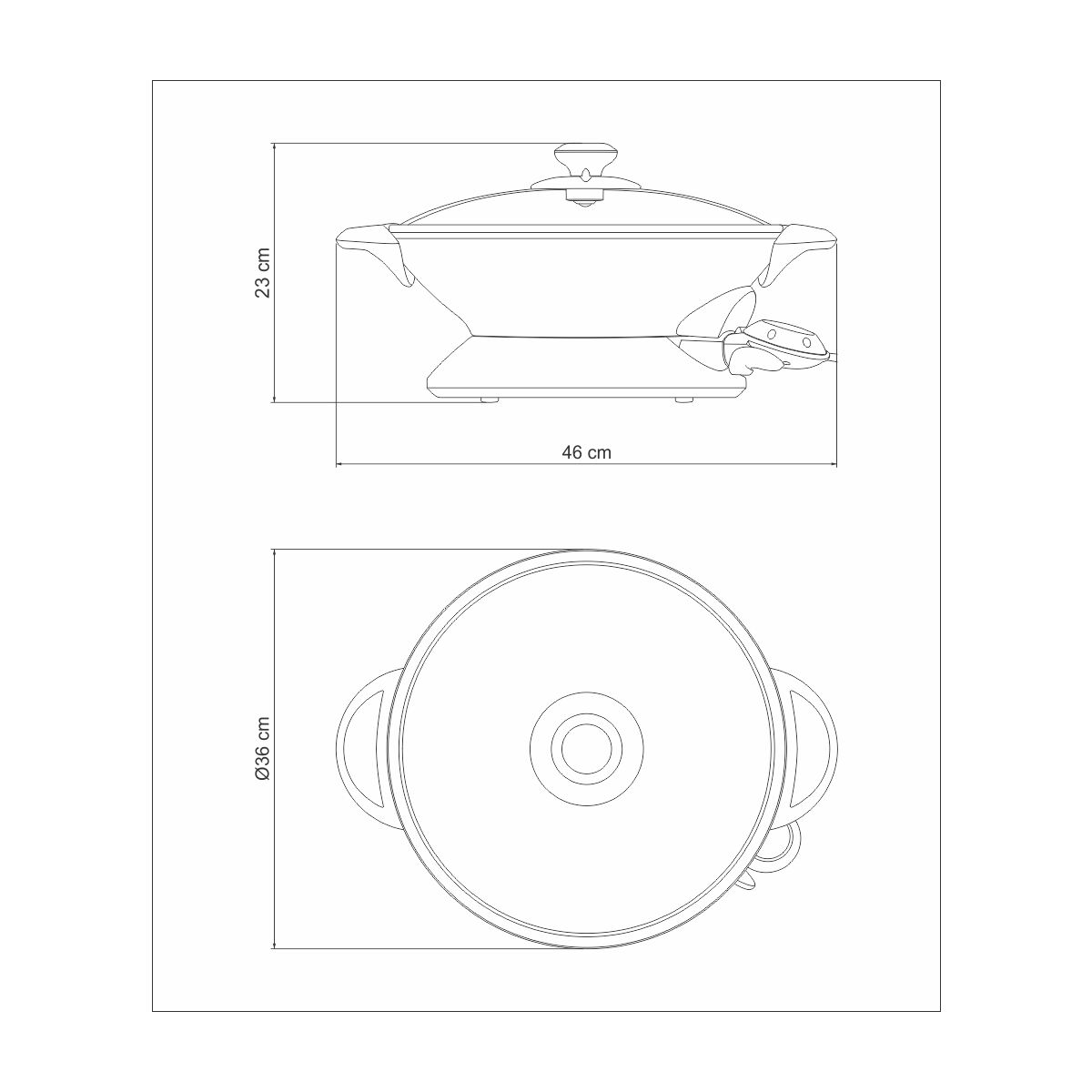 - Panela elétrica de alumínio fundido com revestimento antiaderente. Produto certificado conforme FALCÃO BAUER OCP 0003 Segurança Compulsório INMETRO. - Wok de 6 litros para alta temperatura com base de aço inox. - Com sistema de aquecimento potente que distribui rapidamente o calor pelas laterais da wok, enquanto as camadas de alumínio reagem ao calor mantêm a temperatura alta para refogar os alimentos. - Tampa de vidro temperado com válvula ajustável para saída de vapor. Pode ser utilizado em lava-louça. - Revestimento de antiaderente premium sem PFOA, reforçado com composto exclusivo para preservar as propriedades antiaderentes por mais tempo. - Base desmontável de aço inox para facilitar a limpeza. - Controle preciso de temperatura com 15 posições, alcançando 218°C, simula um autêntico cozimento a gás em estilo asiático. - Ideal para refogar, cozinhar a vapor e fritar.