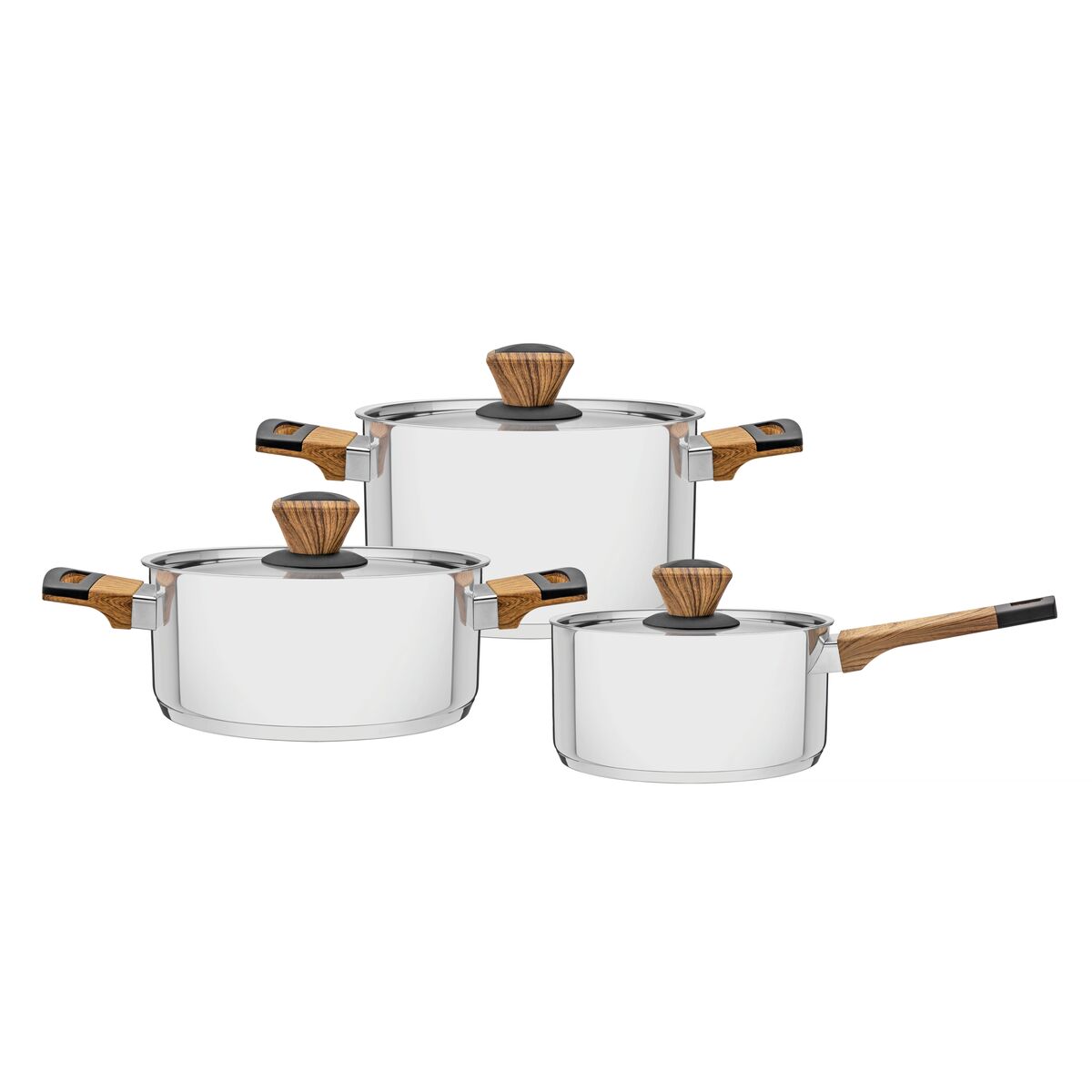 Jogo de Panelas Tramontina Brava Baquelite em Aço Inox com Fundo Triplo Cabos e Alças com Acabamento Efeito Amadeirado 3 Peças