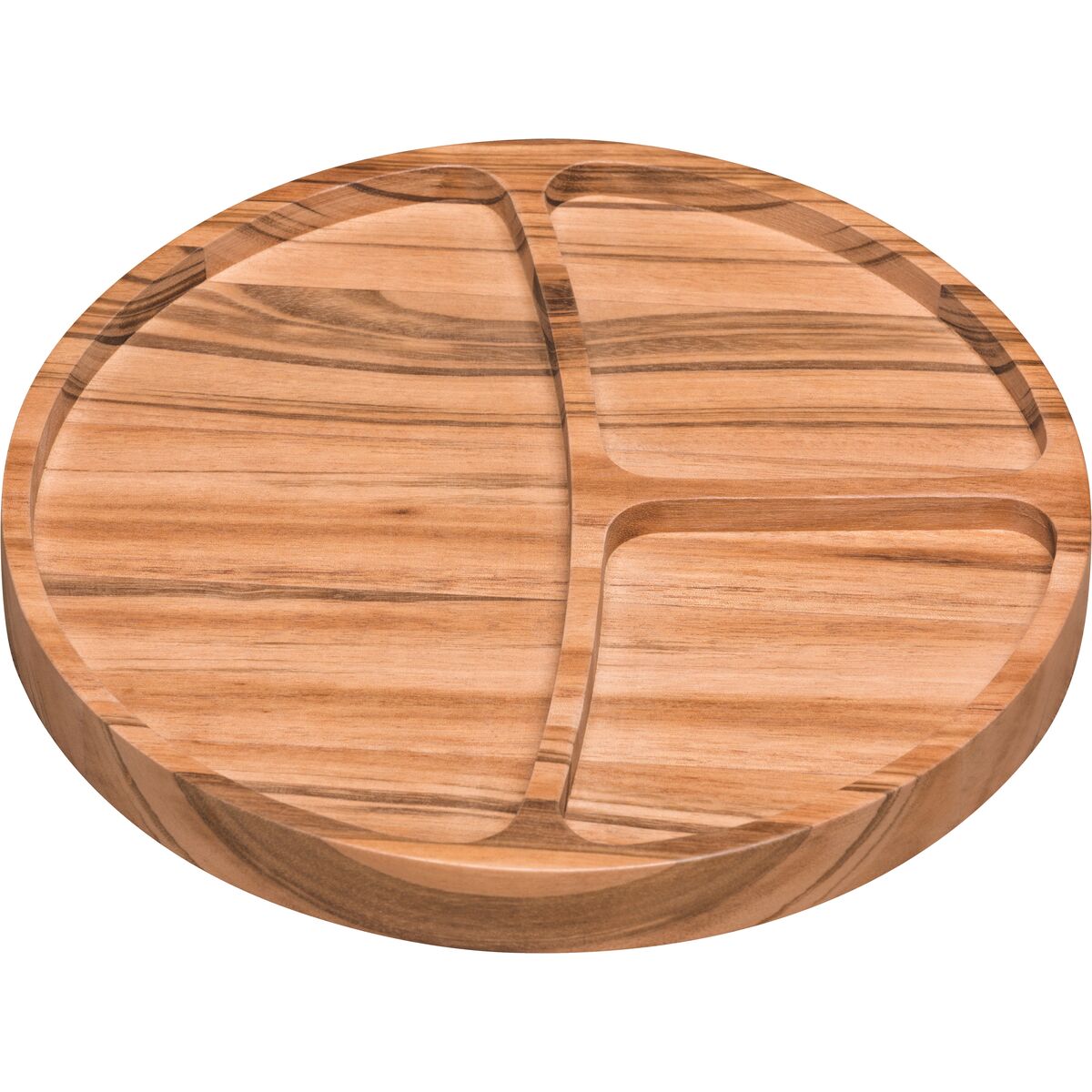 Petisqueira redonda possui 25cm de diâmetro e 2,5cm de espessura. Madeira Muiracatiara e acabamento envernizado.