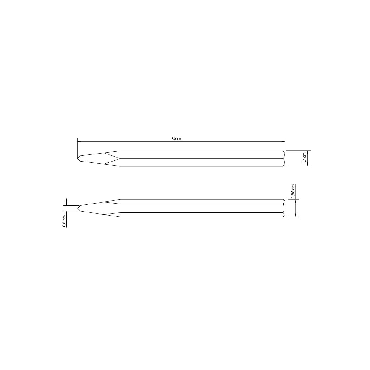 Corpo em aço especial. Barra sextavada. Têmpera por indução nas duas extremidades. Estas ferramentas de impacto tem dureza diferenciada no gume de corte ou ponta e na face de impacto que será golpeada. As ferramentas são submetidas a testes de aplicação prática para garantir sua resistência mecânica em uso intenso. A pintura eletrostática garante proteção excelente contra a corrosão. As ferramentas são produzidas e testadas conforme normas específicas.