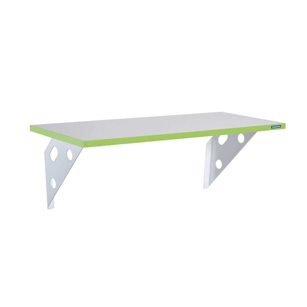 PRATELEIRA COLOR EM MADEIRA MACIÇA, COR BRANCA E BORDA VERDE. ACOMPANHA SUPORTE METÁLICO E KIT DE FIXAÇÃO.