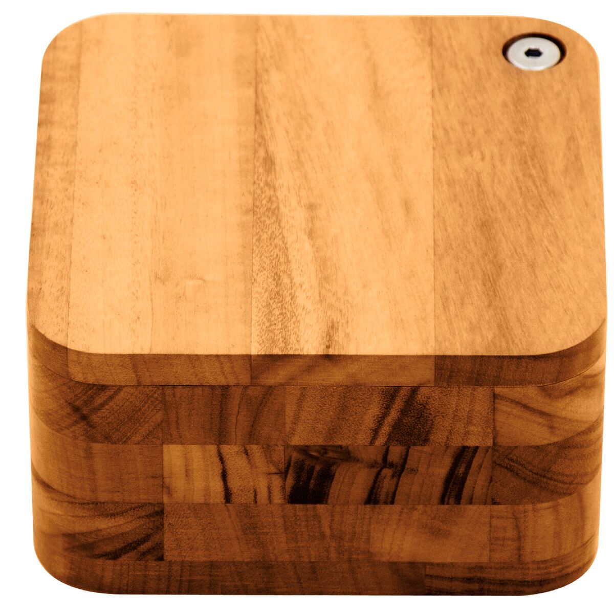 Produto fabricado em madeira Muiracatiara, com acabamento envernizado. Possui 14cm de comprimento, 14cm de largura e 8cm de altura.