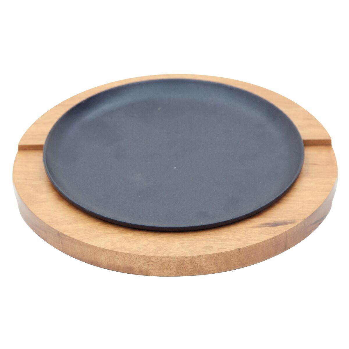 Mix grill fabricado em ferro fundido, acompanha base de madeira muiracatiara, com acabamento envernizado. Possui 30cm de comprimento, 30cm de largura e 2,2cm de altura.