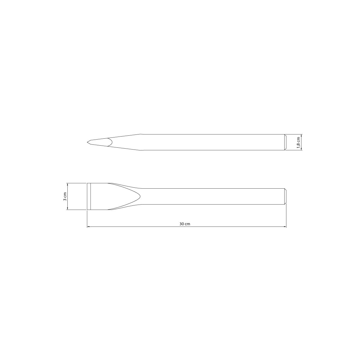 Corpo em aço especial. Barra redonda. Têmpera por indução nas duas extremidades. Estas ferramentas de impacto tem dureza diferenciada no gume de corte ou ponta e na face de impacto que será golpeada. As ferramentas são submetidas a testes de aplicação prática para garantir sua resistência mecânica em uso intenso. A pintura eletrostática garante proteção excelente contra a corrosão. As ferramentas são produzidas e testadas conforme normas específicas.