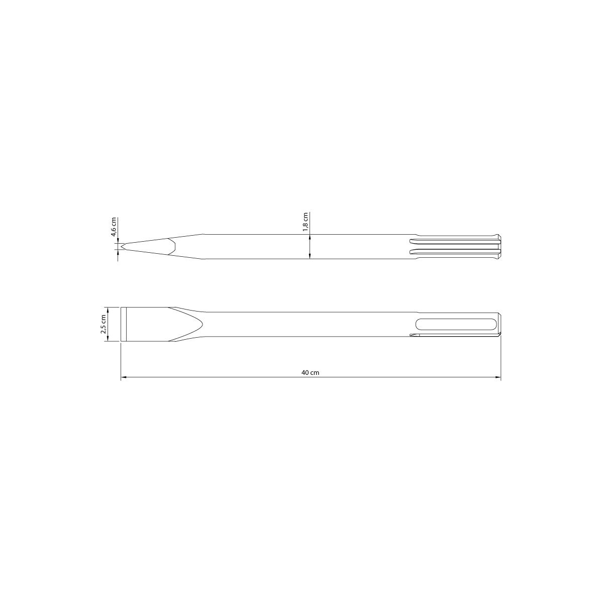 Corpo em aço especial. Acabamento jateado e envernizado. Têmpera por indução nas duas extremidades. Encaixe SDS Max. Estas ferramentas de impacto tem dureza diferenciada no gume de corte ou ponta e na face de impacto que será golpeada. As ferramentas são submetidas a testes de aplicação prática para garantir sua resistência mecânica em uso intenso. Utilizadaem trabalhos de perfuração em pedras, concreto e tijolos juntamente com um martelete rompedor/perfurador. As ferramentas são produzidas e testadas conforme normas específicas.