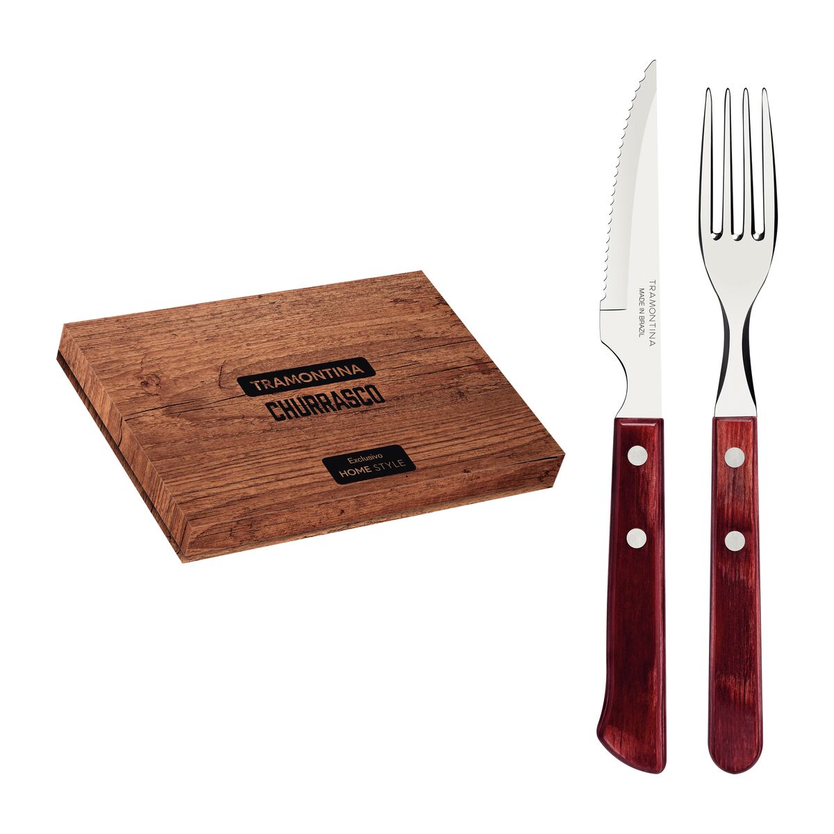 O jogo de talheres para churrasco Tramontina com lâminas em aço inox e cabos de madeira tratada Polywood vermelho 12 peças é a escolha ideal para aproveitar aquele churrasco de domingo especial com sua família e amigos. Desenvolvido com lâminas em aço inox e cabos madeira tratada Polywood, ele tem peças resistentes à impactos, altas temperaturas. Suas facas tem lâmina em aço inox com tratamento térmico que proporciona excelente fio de corte e os garfos contam com maior espessura e estampagem do aço, que evita deformações. Além dessas características, os talheres podem ir à máquina de lavar louças e facilita suas tarefas na cozinha!