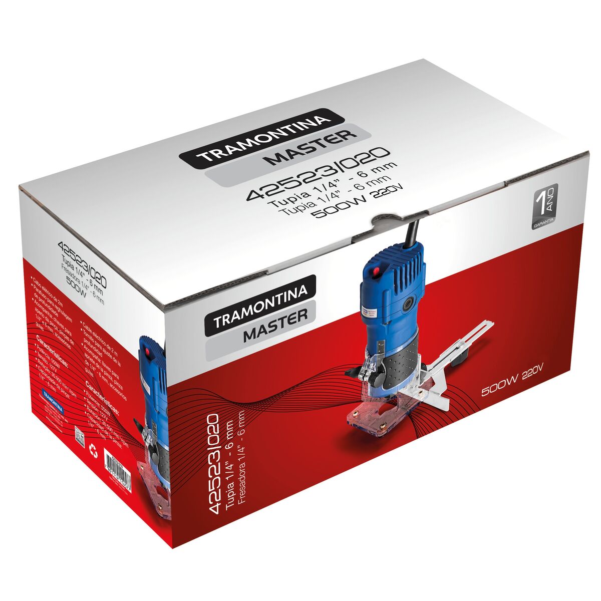 Potência: 550 W. Frequência: 50/60 Hz. Rotação: 0-30.000 min-1 / rpm. Corpo e botões injetados. Cabo elétrico de 2 m. Ajuste de profundidade prático e preciso. Acompanha pinça de 1/4 e 6 mm, 2 chaves 10 e 17 mm, para troca de fresas e manual de instruções. A Tupia foi projetada para fresar madeira, plásticos e materiais leves. Ela é apropriada para fazer perfis, sulcos, ranhuras, chanfros, etc. Para ter mais precisão nos processos pode-se utilizar a escala de ajuste da profundidade e também a placa guia.